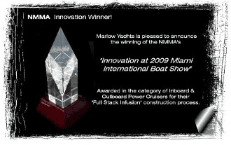 Marlow Yachts was honored to accept this award at the 2009 Miami International Boat Show. We were awarded for our “Full Stack Infusion ©” construction process. This proprietary process produces a near perfect laminate providing for a more open interior with greater structural strength. This combination of benefits results in dramatic weight savings with increased hull performance and efficiency.
