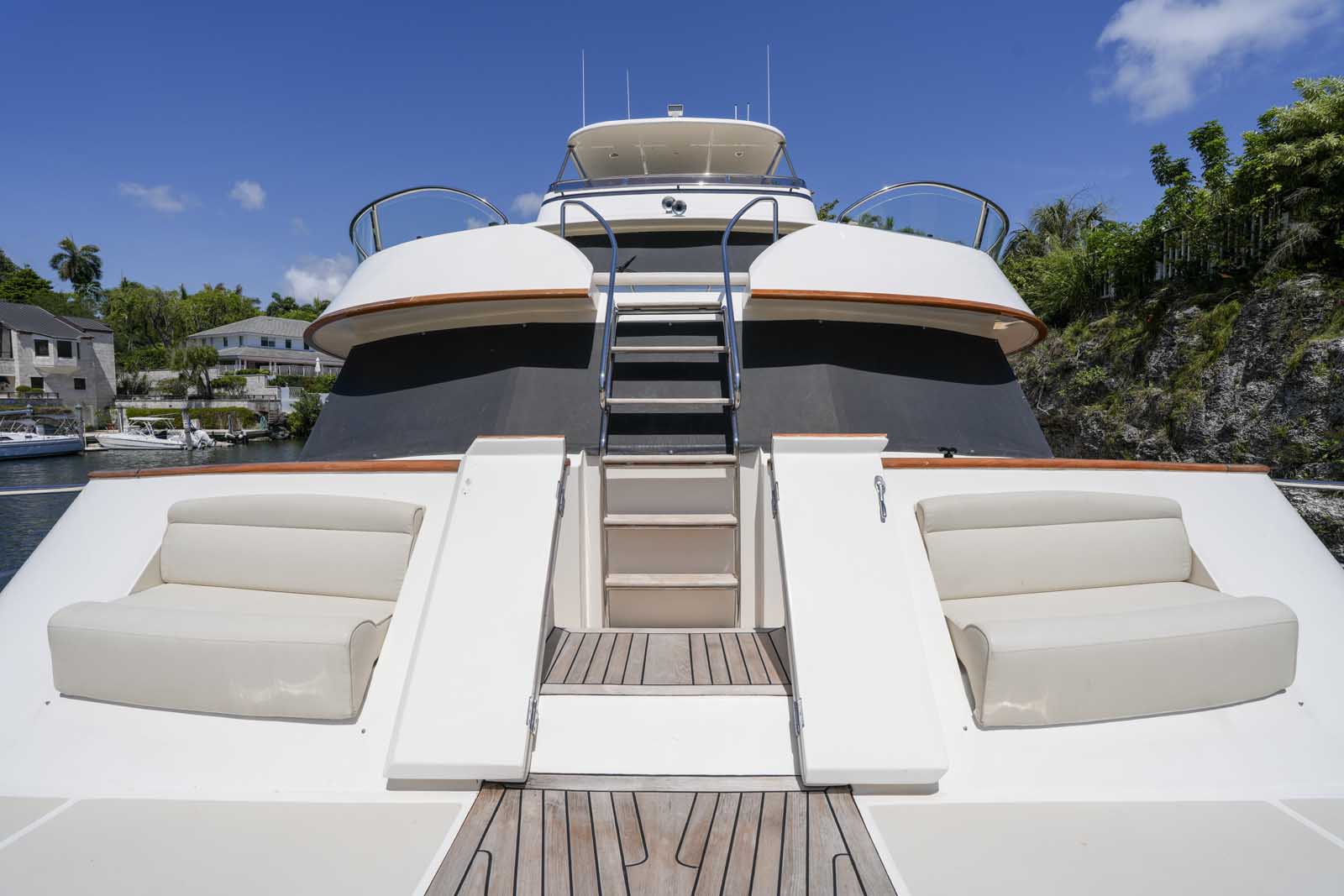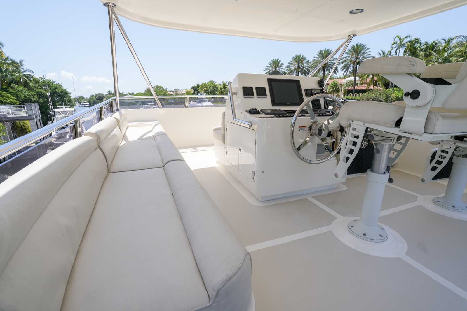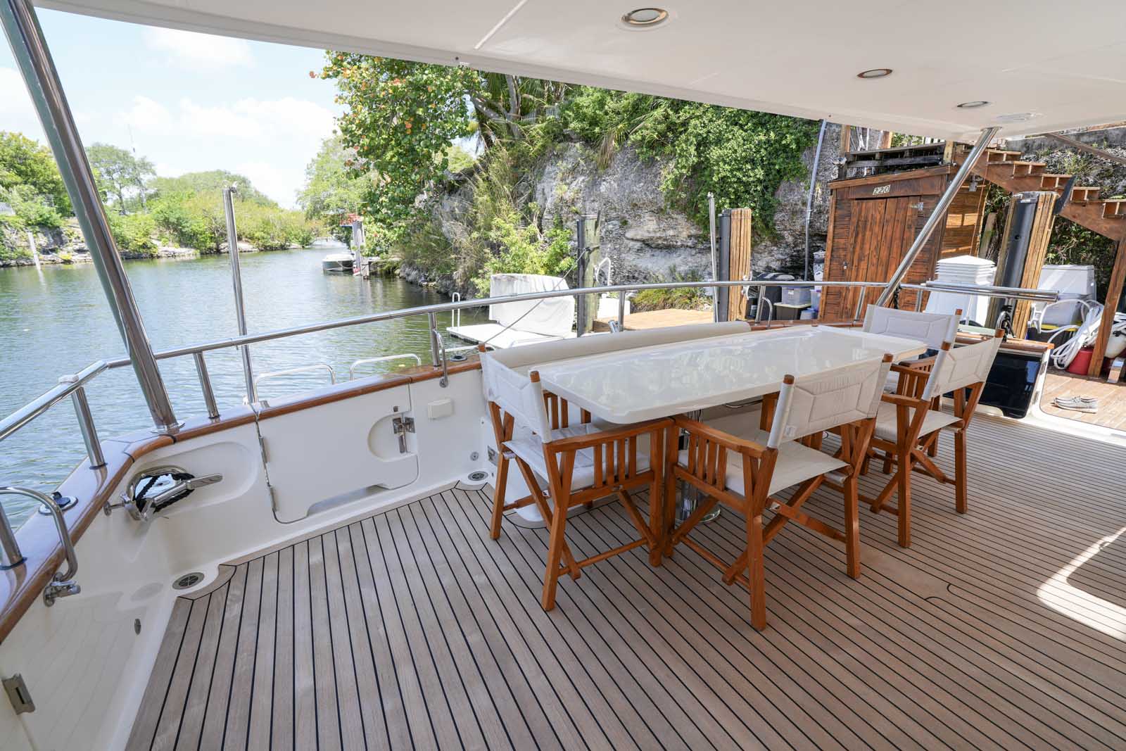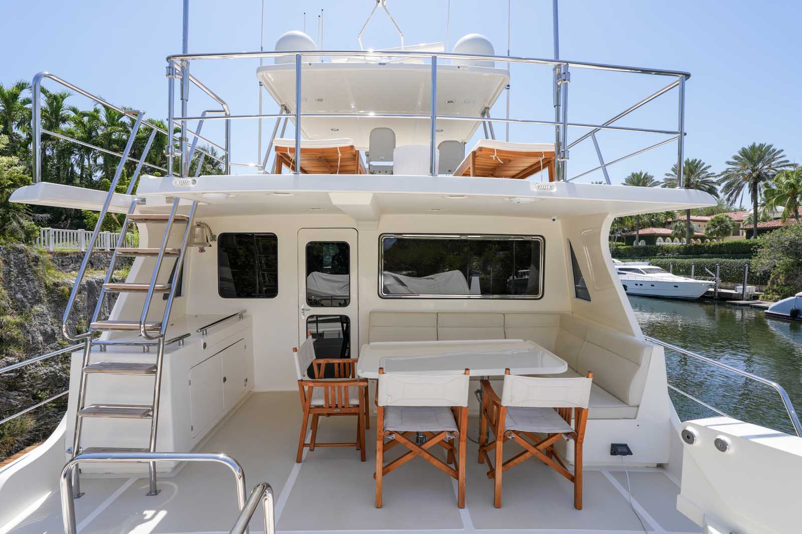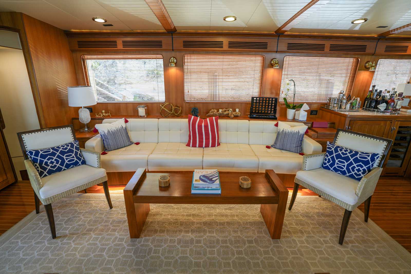 Welcome aboard! The large aft deck is your point of entry, where your lifestyle guides the options for outdoor living and entertaining. Hidden grills, settees with a table, or a chaise lounge can be built in for comfort and function while maintaining the beauty of the open space. Leaving the aft deck, entry into the saloon presents a long, unobstructed view all the way into the pilothouse. The woodworking, as on all Marlow Explorers, is impeccable, with grain-matched veneers throughout, achieved by the use of one single log to supply the veneers for the entire yacht.