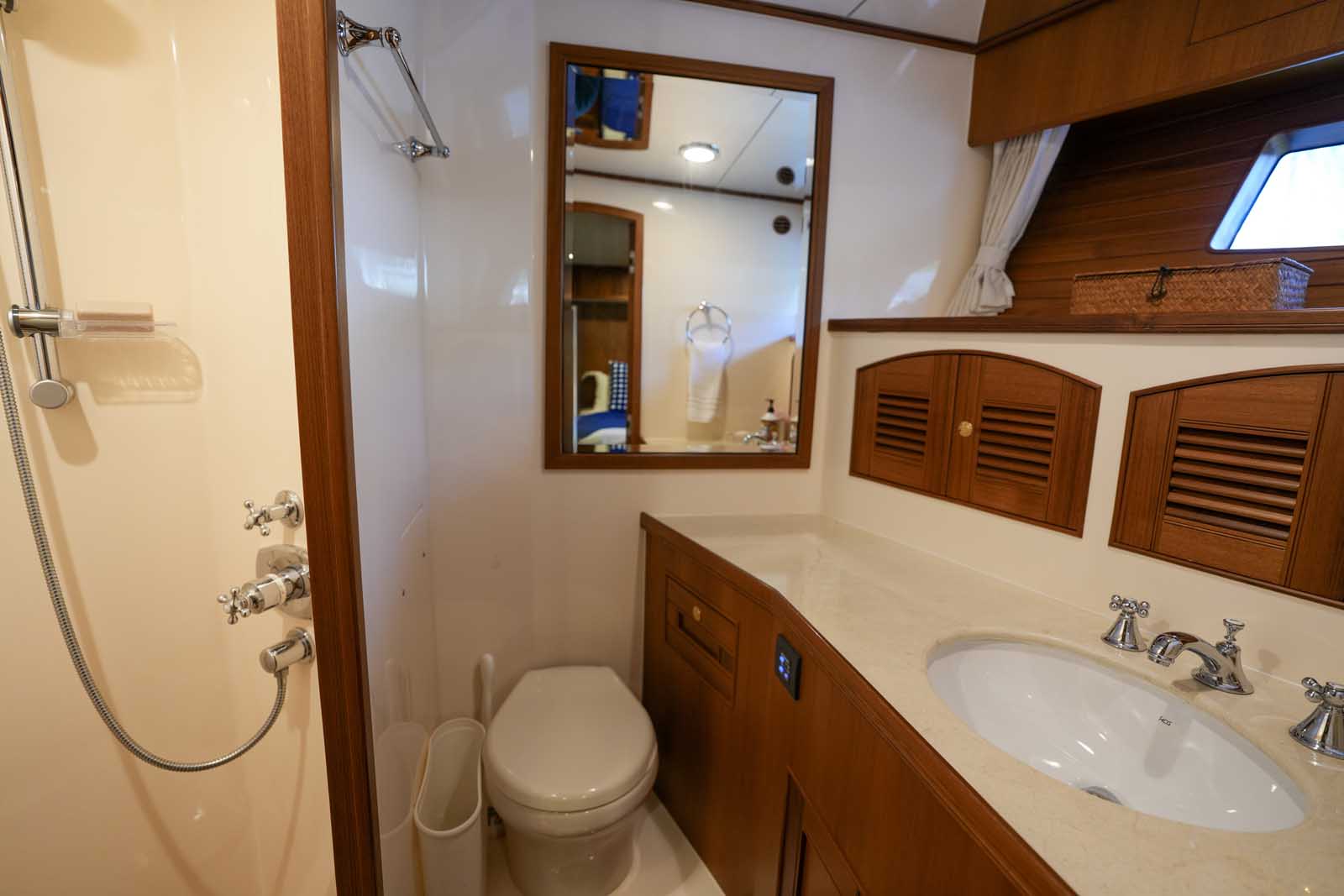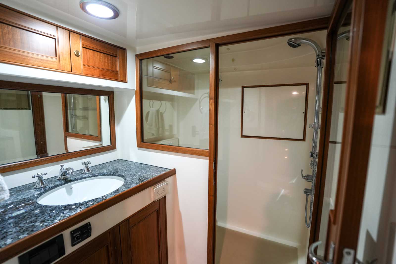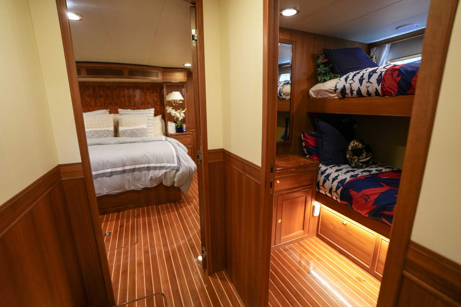 The forward VIP has a king berth, vanity, flat-screen TV, ample storage, and a private head with sink, toilet, and glass stall shower. The port-side guest stateroom offers twin beds, a cedar-lined hanging locker, and a private head with a stall shower. The starboard side stateroom features a bunk with a laundry center concealed under it. The option for a walk-in pantry is also available.