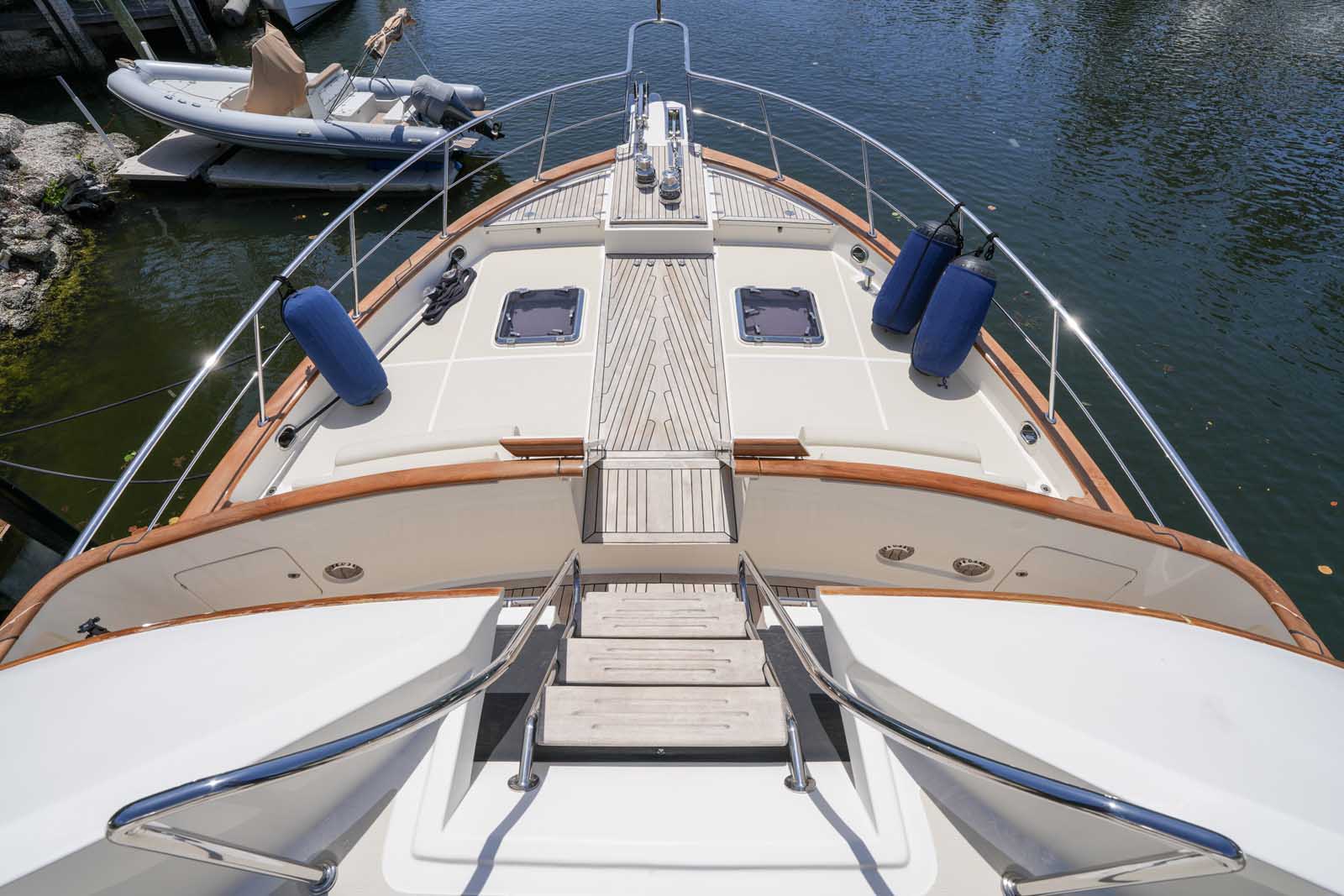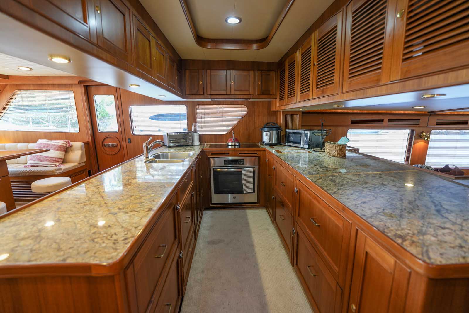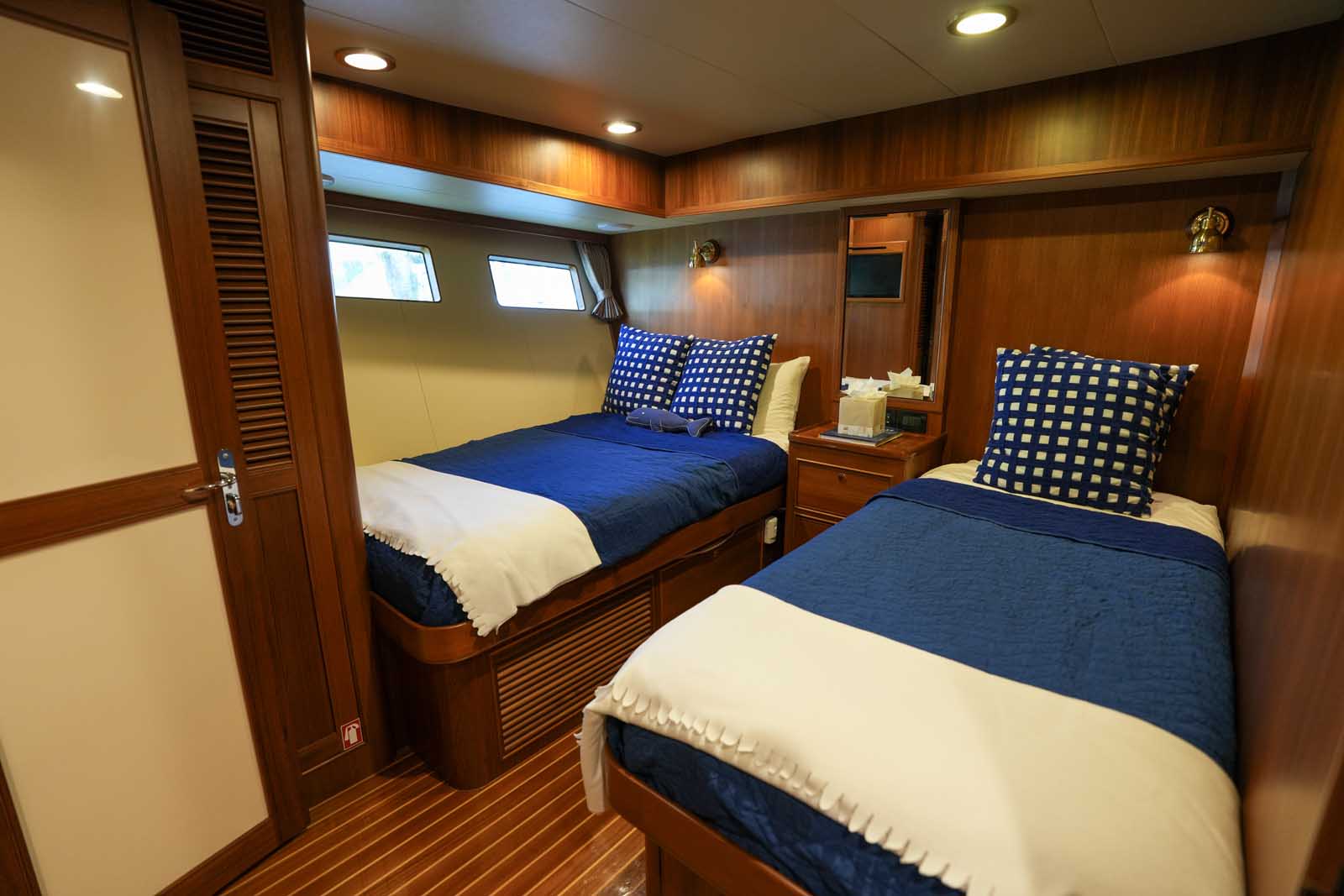 The forward VIP has a king berth, vanity, flat-screen TV, ample storage, and a private head with sink, toilet, and glass stall shower. The port-side guest stateroom offers twin beds, a cedar-lined hanging locker, and a private head with a stall shower. The starboard side stateroom features a bunk with a laundry center concealed under it. The option for a walk-in pantry is also available.