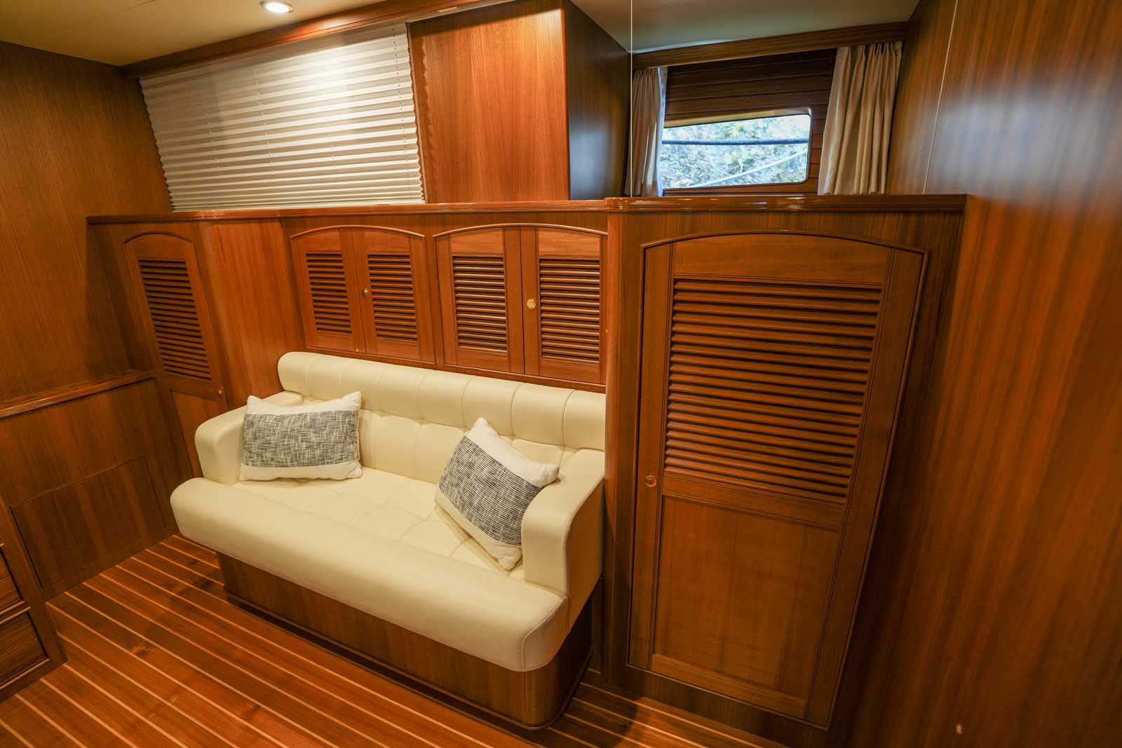 The immense expanse of saloon sole is a continuous run with no cross seams anywhere. With a minimum of ten coats of varnish, the interiors glow with a luxurious and inviting warmth. Regardless of the layout, there are features that are constant and consistent in all of our models – flawless joinery work, fully finished Formica-lined storage areas, dovetailed drawers, and high-quality hardware. The built-in sofa with storage and coffee table are on the port side, facing two occasional chairs flanking their own coffee table on the starboard side. Additional features include a wine locker, entertainment center with wet bar and icemaker, TV cabinet with pneumatic lifts for invisible stowage, and lovely bent wood signature overhead handrails.