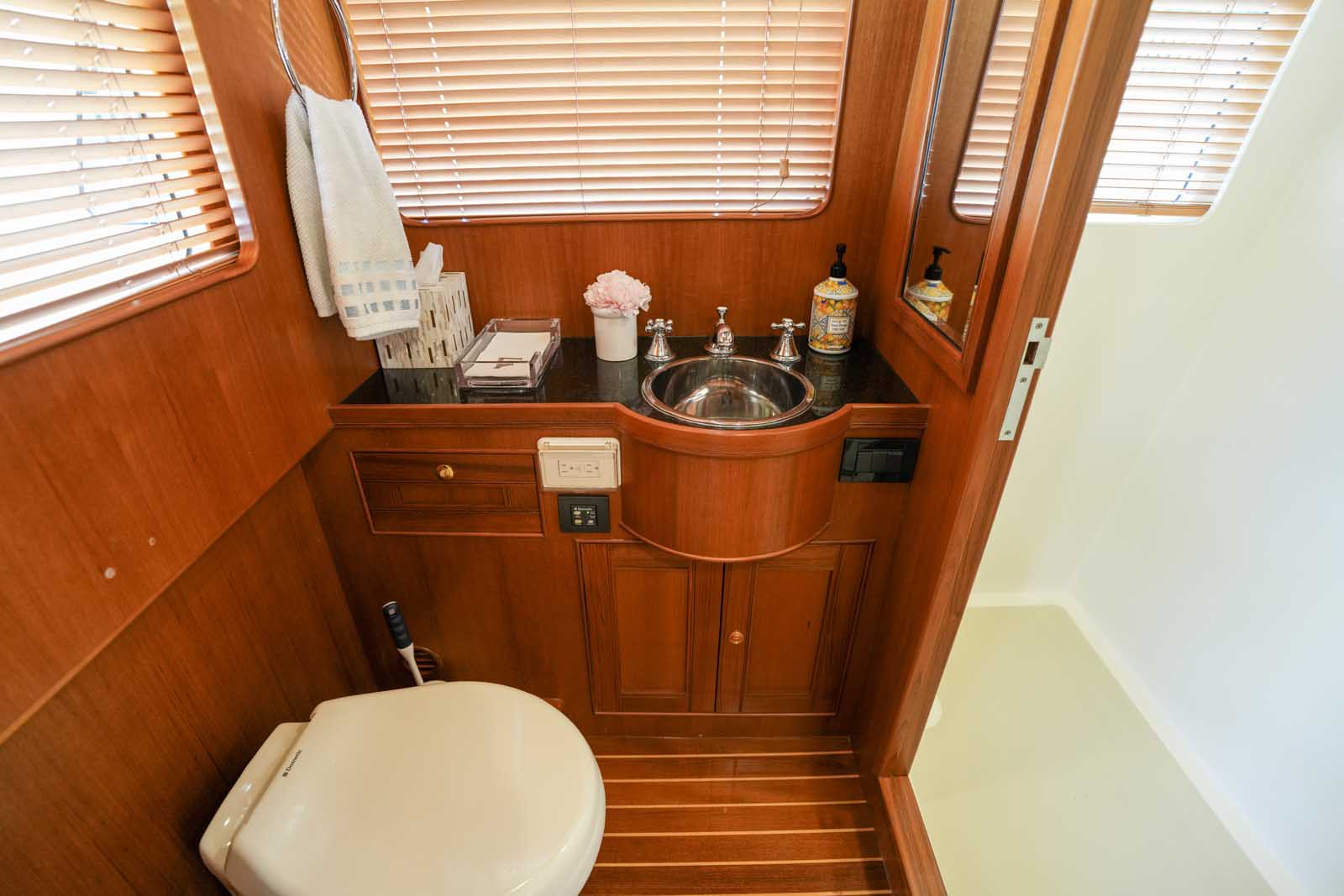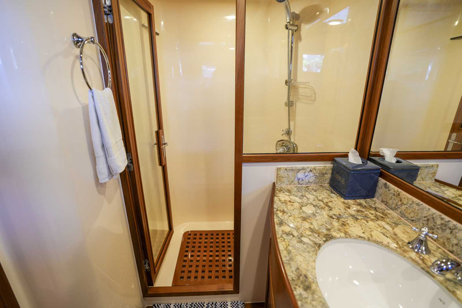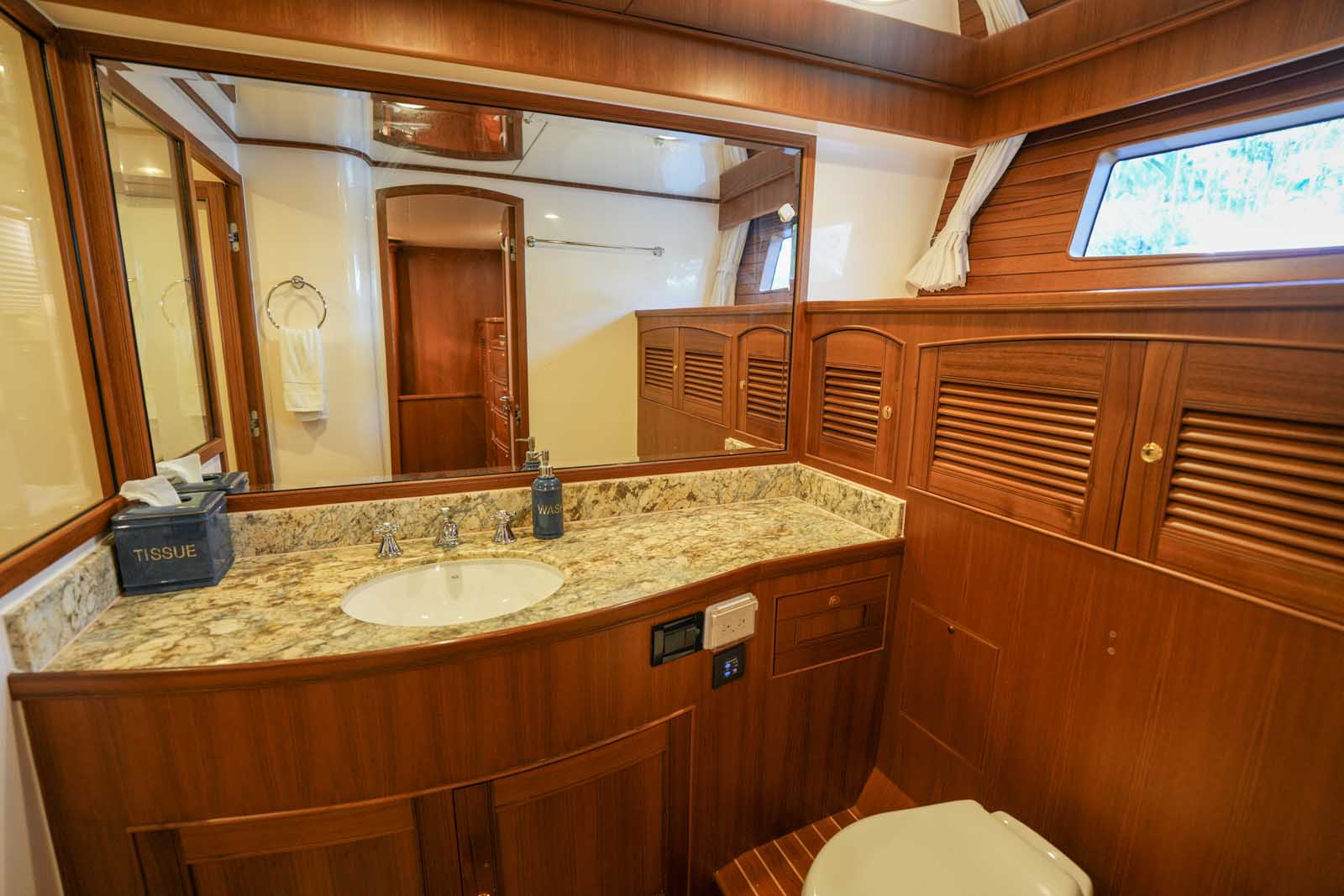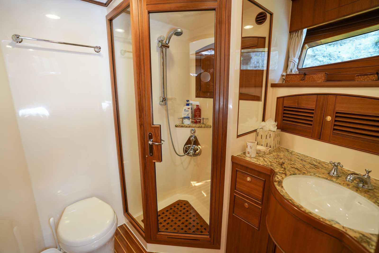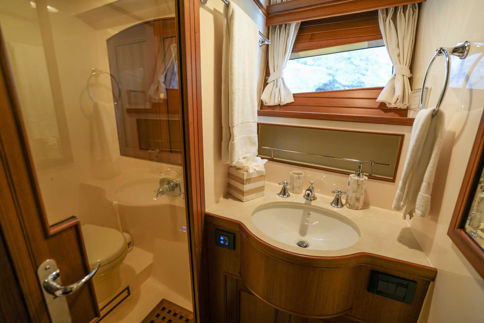 A curved teak stairway leads to the accommodations deck, where either three or four staterooms are found. The spacious master stateroom features a centerline king-sized bed flanked with twin nightstands, your choice of configuration, drawer storage, a mirrored vanity, cedar-lined hanging lockers, or bookcases in any combination. The his and hers heads share a generous shower with an optional tub. All bath hardware is Grohe Infinity, the sinks are china or optional onyx, and the counters are in a choice of granite, marble, or Corian.