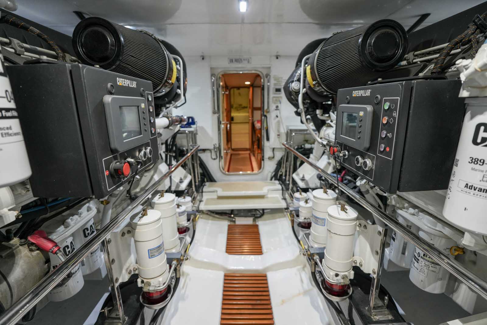 Access to the pristine engine room is through a watertight door. Once inside, the full-height, climate-controlled engine room allows for ease in engine maintenance.