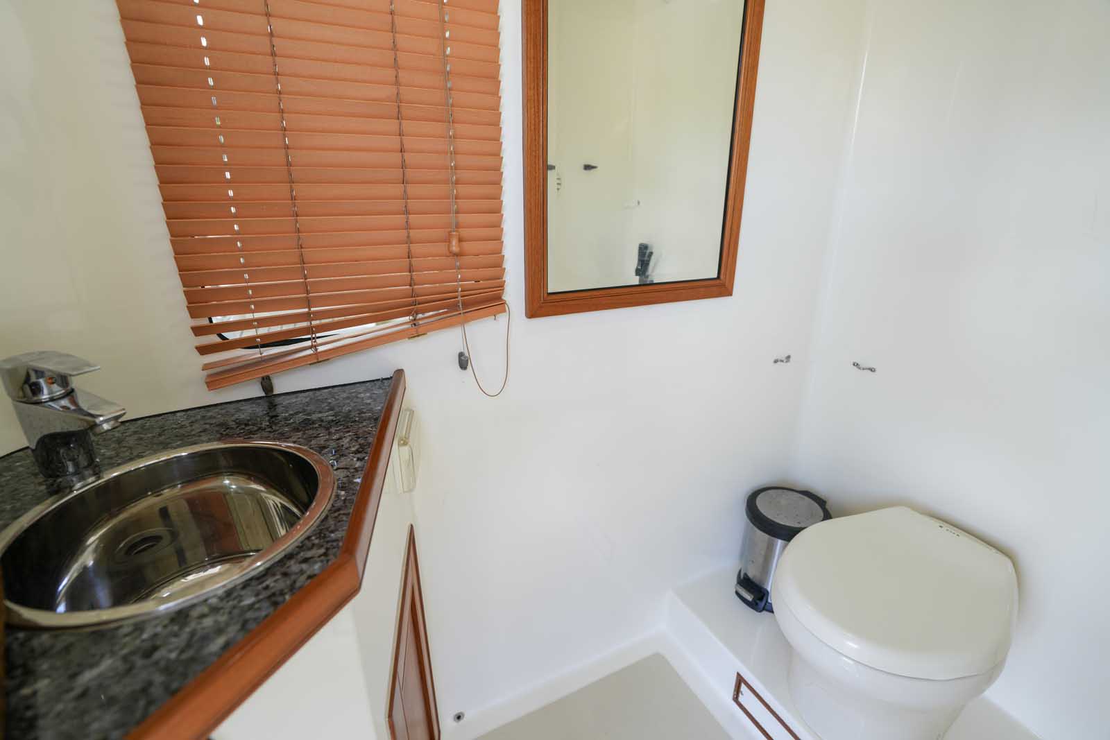 The layout and shape of the lazarette and crew quarters provide large areas for storing all your toys and gear, a workshop and bench, and crew quarters that most 120′ yachts would envy. There is a queen bunk, a u-shaped settee with a table, microwave, fridge, icemaker, TV, and full stand-up head and shower.